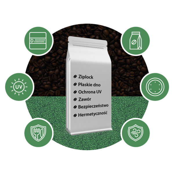 • Wielowarstwowe, szczelne. Nasze opakowanie wykorzystuje materiały nieprzezroczyste oraz dodatkowo zabezpiecza wnętrzeprzed wpływem promieniowania UV, aby zachować jakość i świeżość kawy przez dłuższy czas.